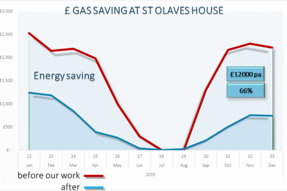 66% gas saving achieved with incremental improvement in Building Management System over 2 years.